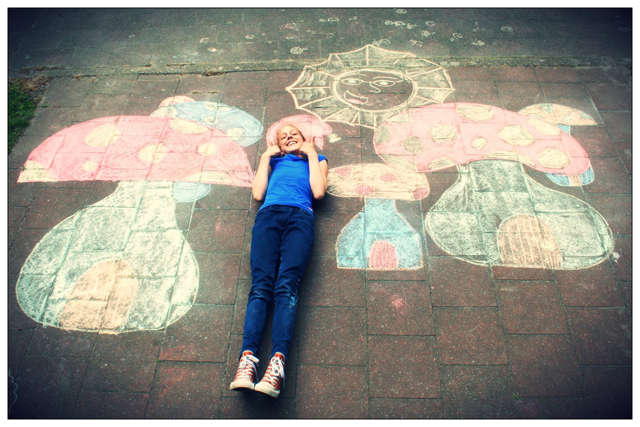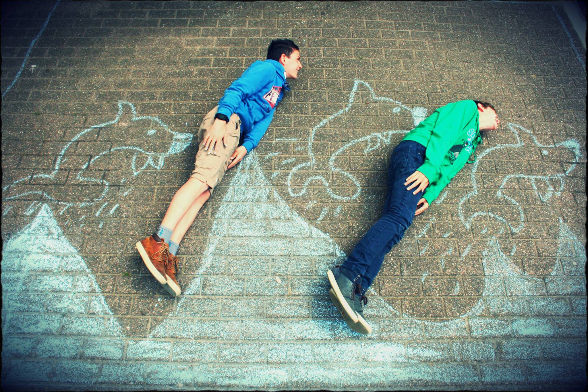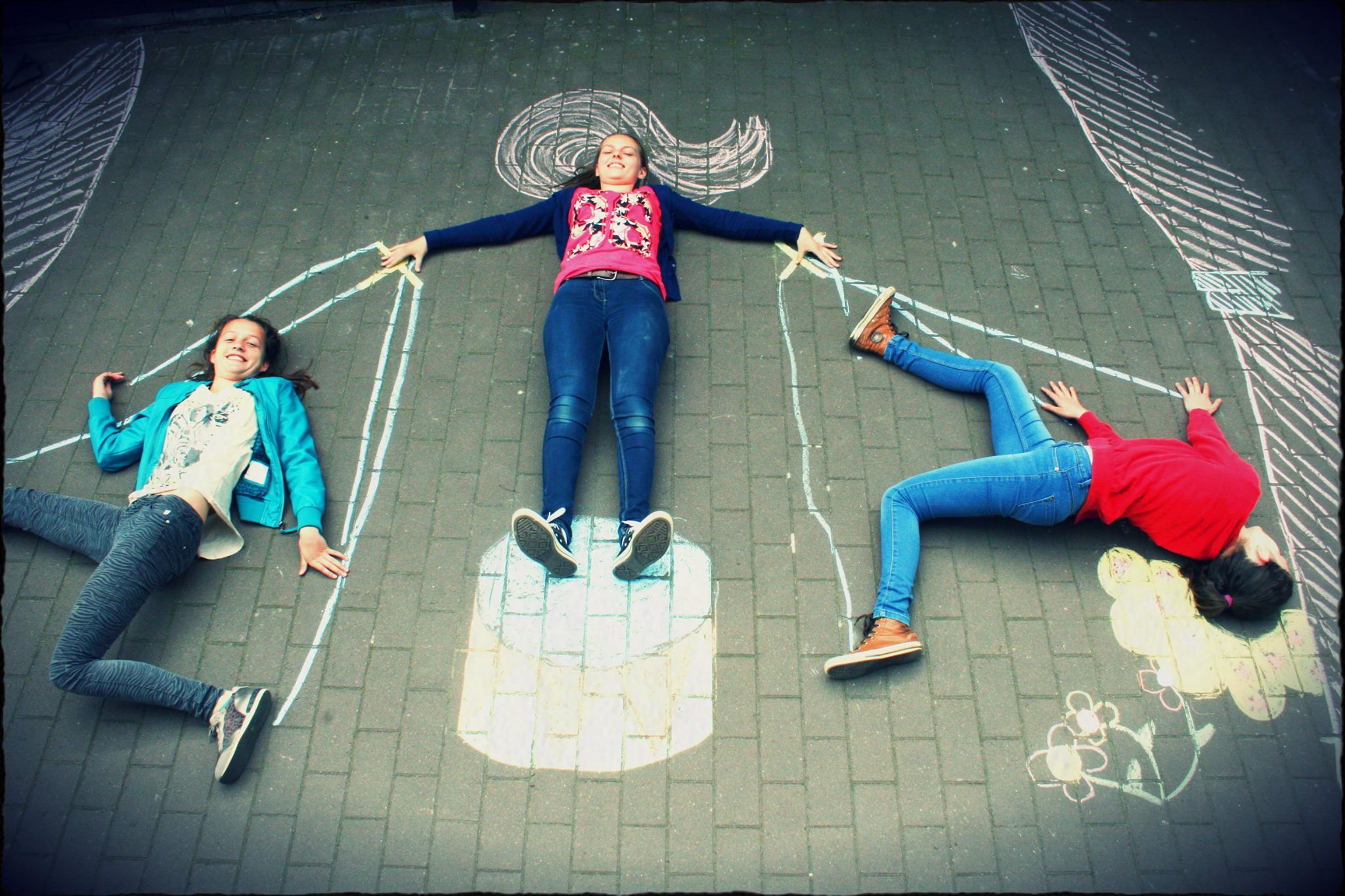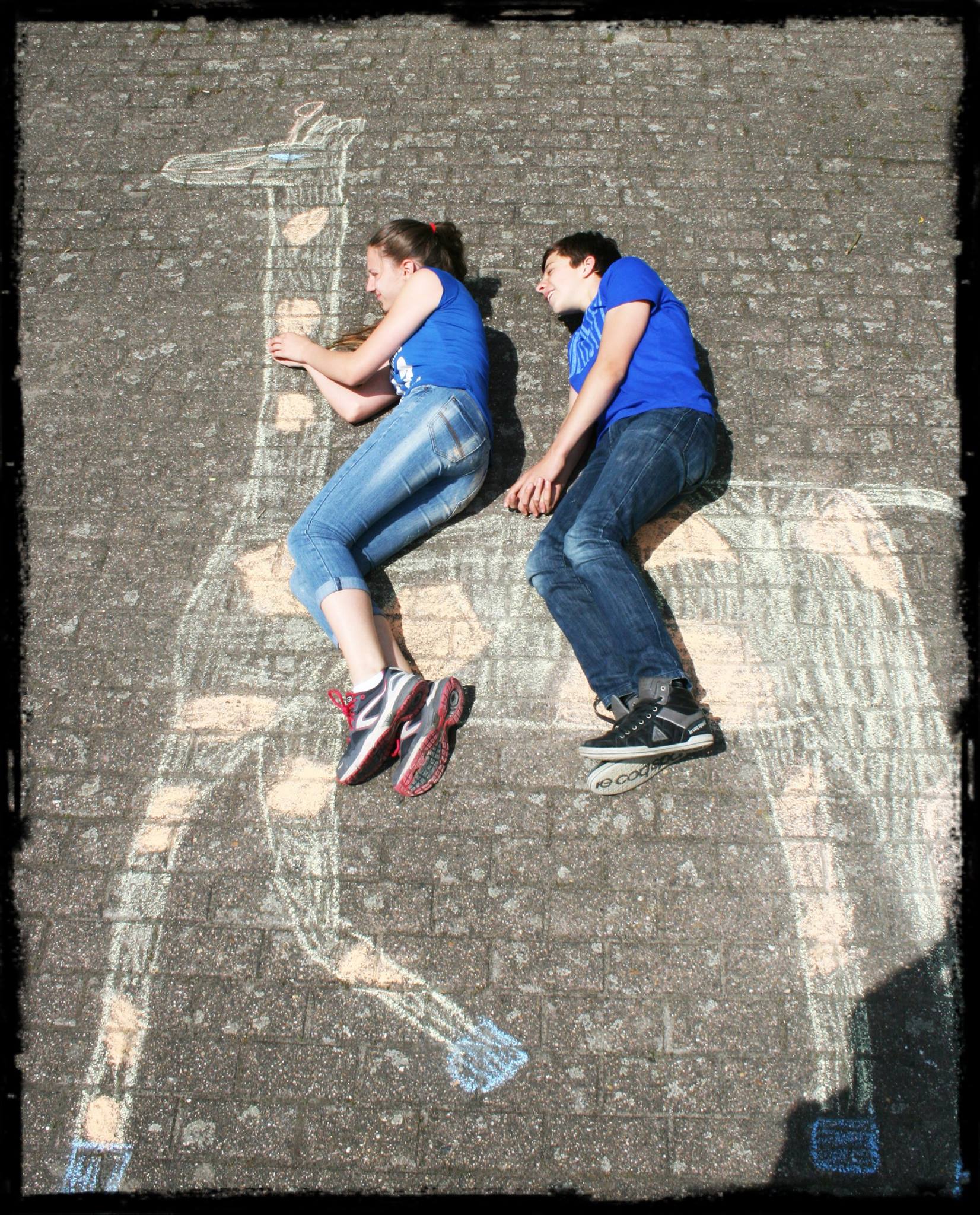 Tijdens de lessen onder leiding van mevr. Kooijmans mochten de tweedejaars zich uitleven met stoepkrijt.