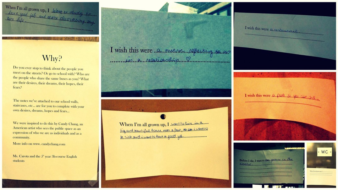 Het betrof een talig kunstproject voor het vak Engels geïnspireerd op het werk van de Amerikaanse kunstenares Candy Chang, die de publieke ruimte als kunstobject gebruikt, omdat ze van mening is dat kunst thuishoort onder de mensen en niet in een museum. Bovendien probeert ze op die manier een band te scheppen tussen mensen die elkaar anders voorbij zouden lopen in een verstedelijkte publieke omgeving. De publieke ruimte moet net de gemeenschapszin versterken, niet mensen van elkaar isoleren… Meer info over haar werk vindt u op www.candychang.com.