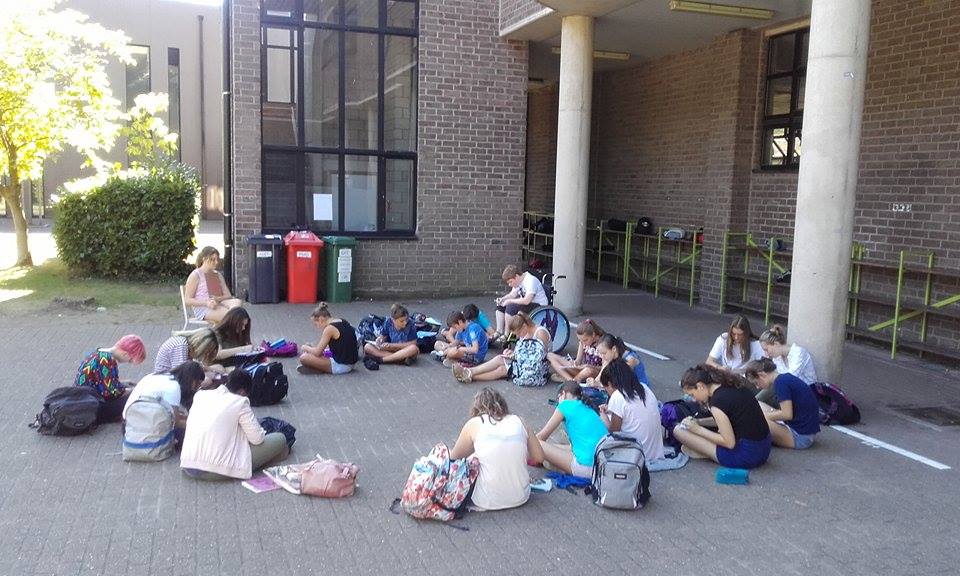 In veel lokalen is het deze dagen zweten geblazen. Daarom trokken enkele klassen naar buiten om daar les te volgen.