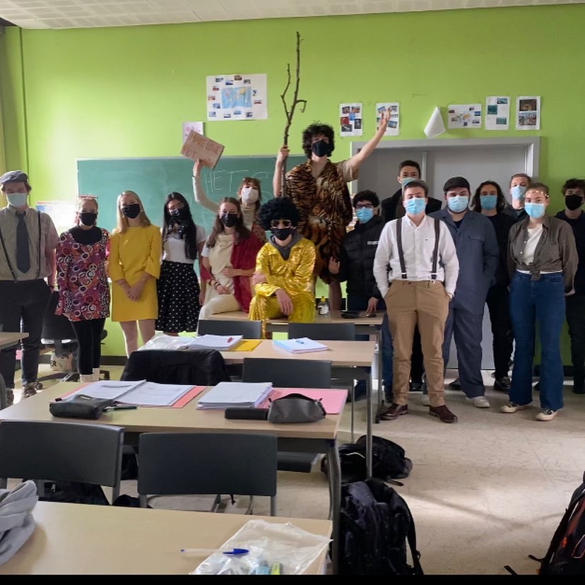 Sprookjesfiguren, opvallende duo’s, historische figuren, margi’s, …, ze passeerden allemaal de revue deze week. De aanleiding? De laatste 100 dagen van zesdejaars, uiteraard. Elke dag kwamen ze verkleed naar school.