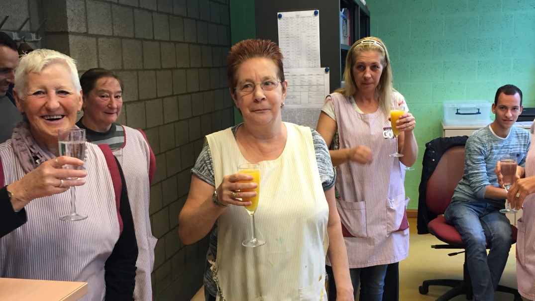 Vandaag doet poetsvrouw Betty na 22 jaar trouwe dienst voor het laatst haar ronde op onze school. Gisteren zwaaiden haar collega’s haar al uit.