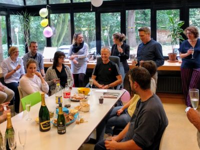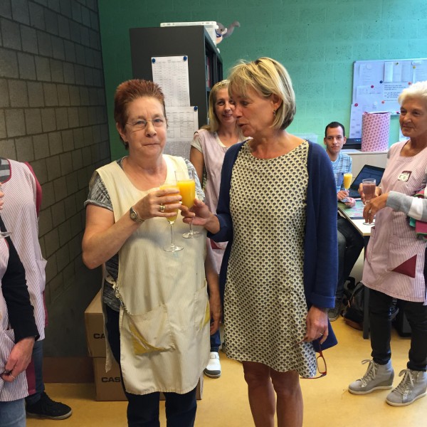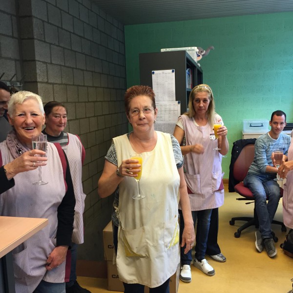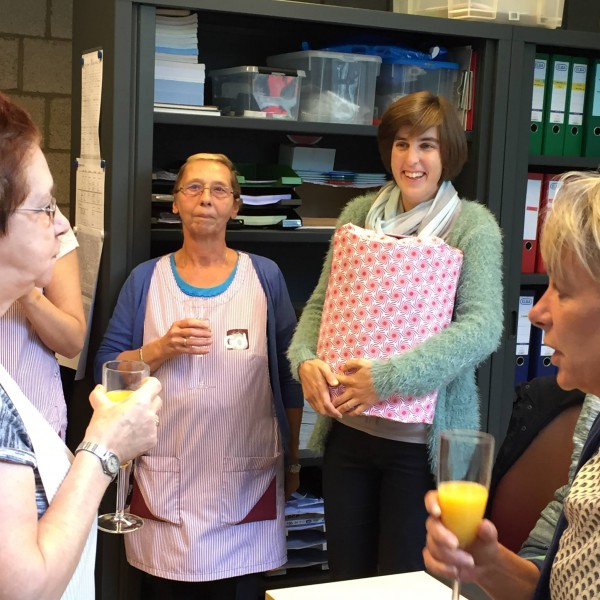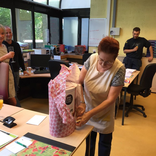 Vandaag doet poetsvrouw Betty na 22 jaar trouwe dienst voor het laatst haar ronde op onze school. Sinds 8 februari 1993 veegt ze vloeren, poetst ze trappen en zet ze koffie, maar vanaf donderdag geniet ze van haar welverdiend pensioen. Omdat er vandaag nog maar weinig collega’s aanwezig zullen zijn als ze effectief haar laatste bezemstreken doet, zwaaiden haar collega’s haar gisteren al uit met een drankje en een cadeautje.