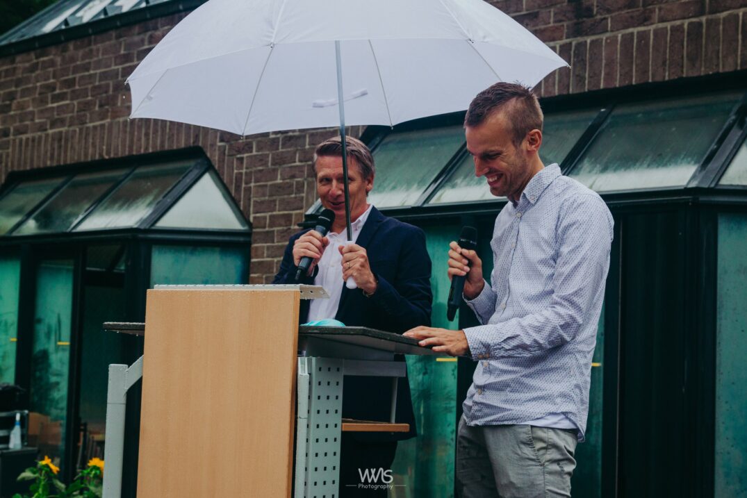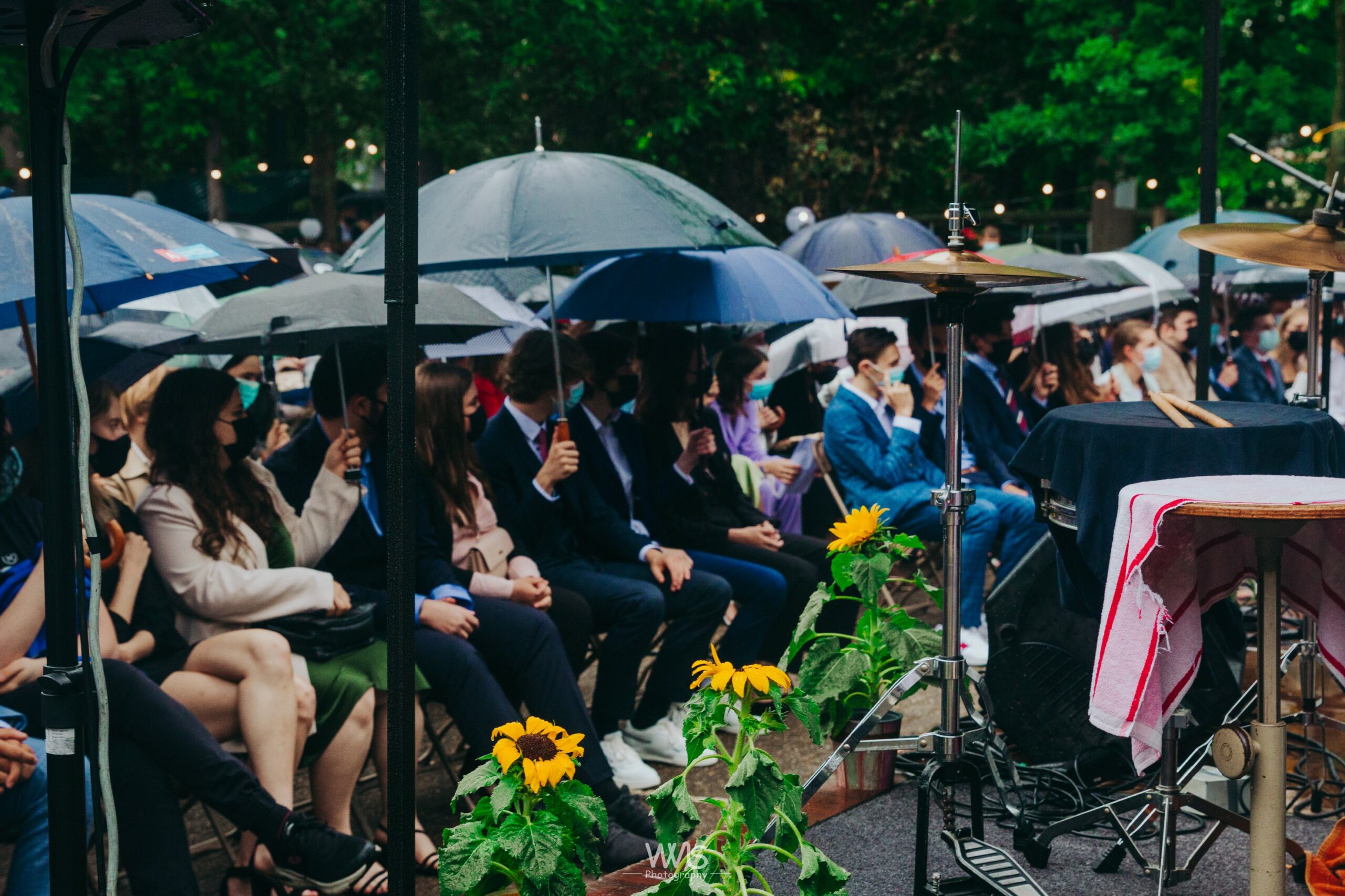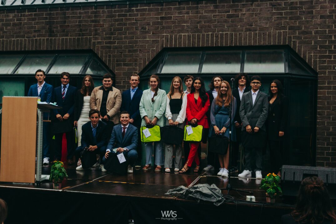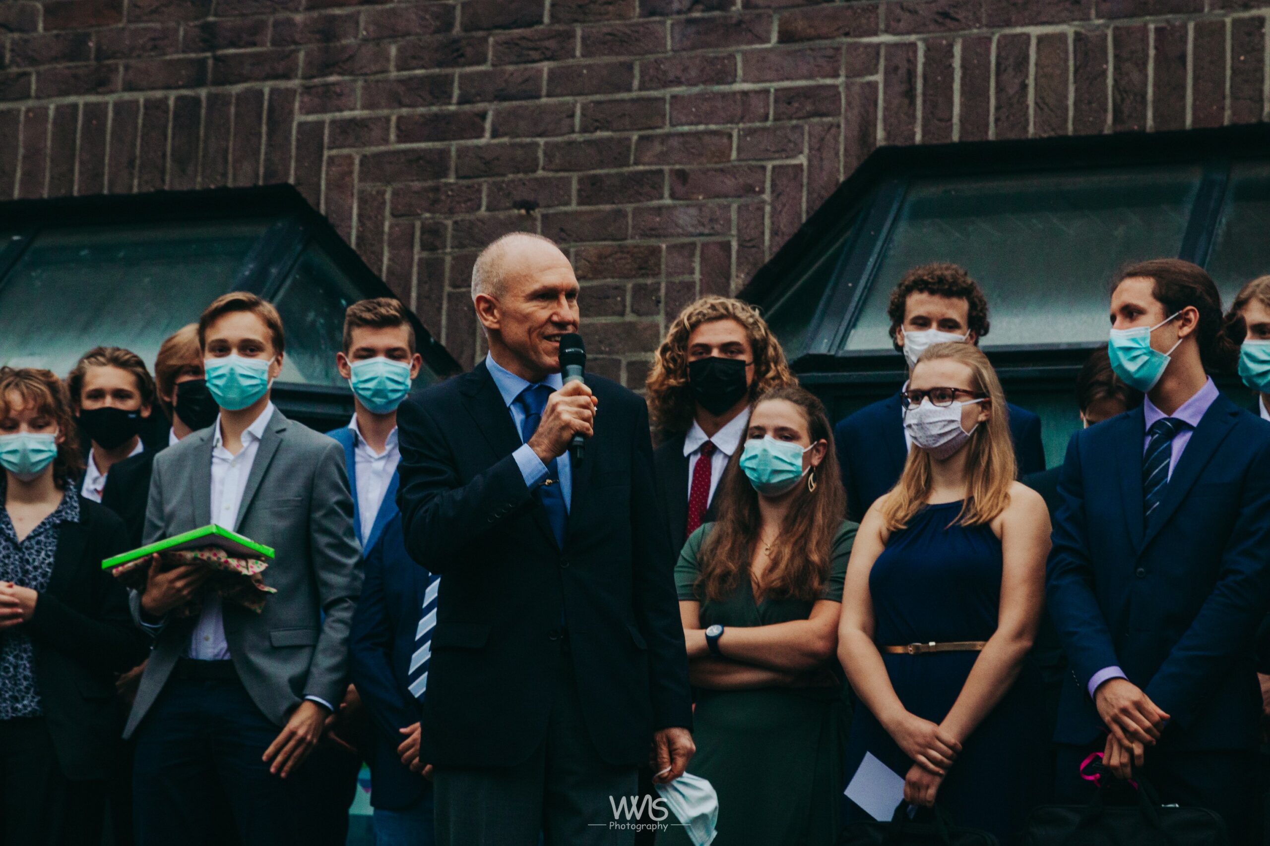 Vorige week namen we afscheid van onze zesdejaars. De maatregelen lieten toe om twee gasten uit te nodigen, op voorwaarde dat de proclamatie buiten kon plaatsvinden. De zon liet ons in de steek die avond, en in de loop van de avond hield het op met regenen. Ondanks de regen maakten we er een mooi afscheidsfeest van.