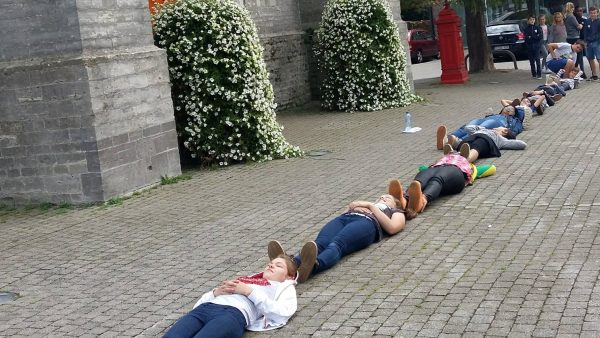 Wat moet je doen als je wil weten hoe hoog de kerktoren van Ekeren is? 2 klassen eerstejaars op de grond leggen!
